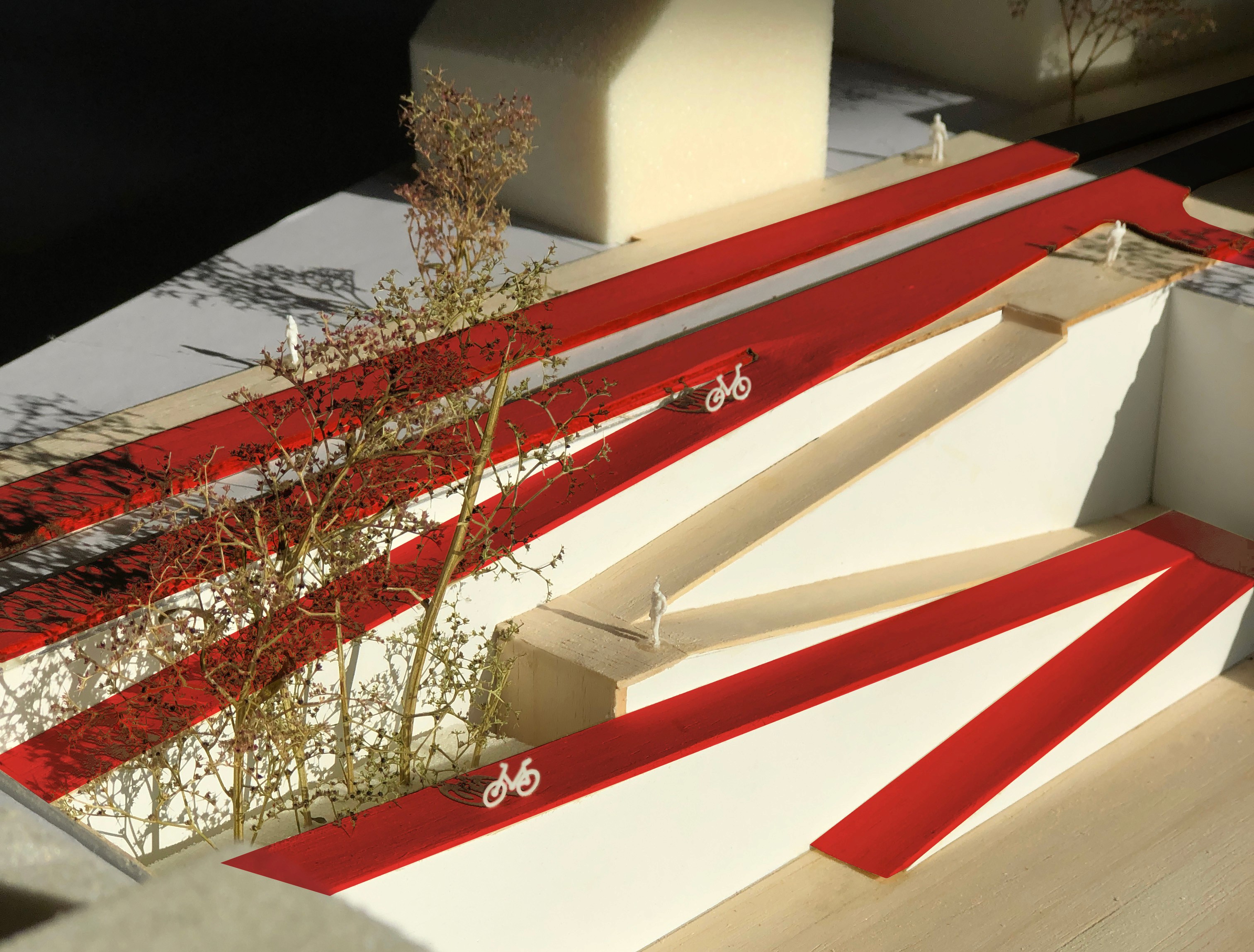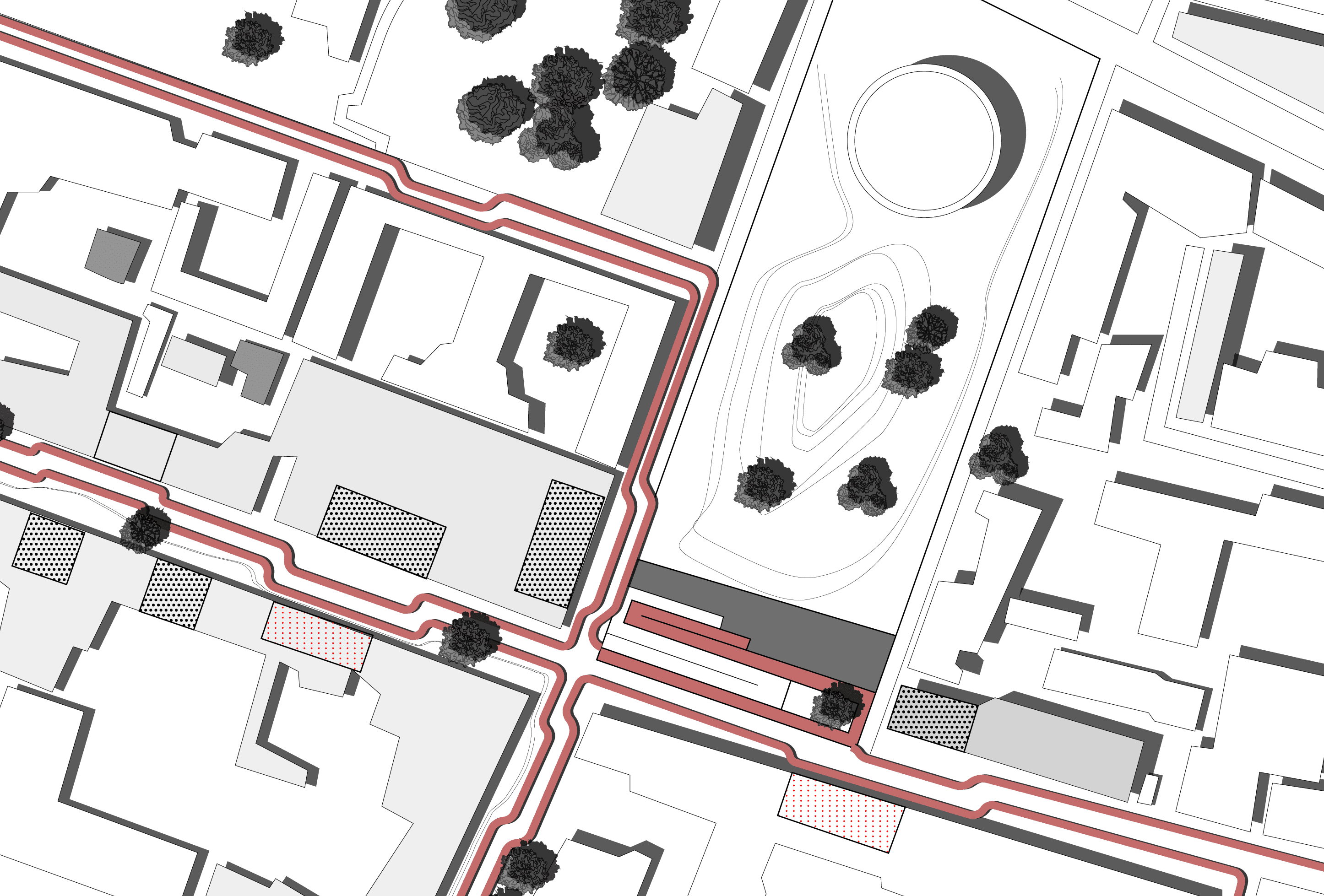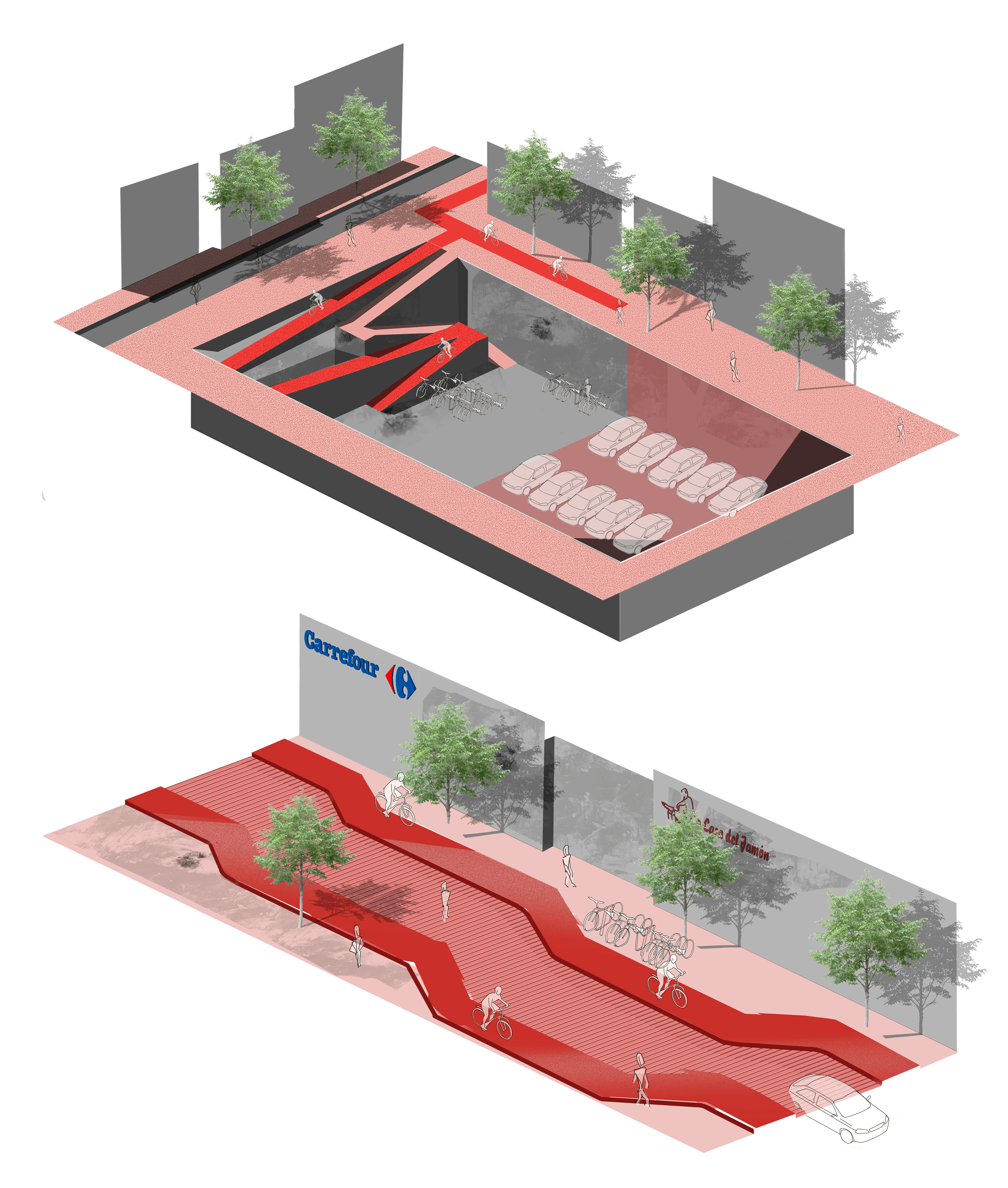 Topographie active : Utilisation de pentes douces connectant le sous-sol à la surface, invitant naturellement les usagers à parcourir la rue piétonne.